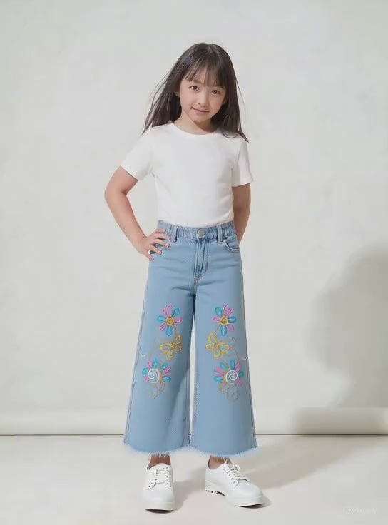 Kids Blue Jeans with Multicolor Embroidered Wide-Leg Jeans